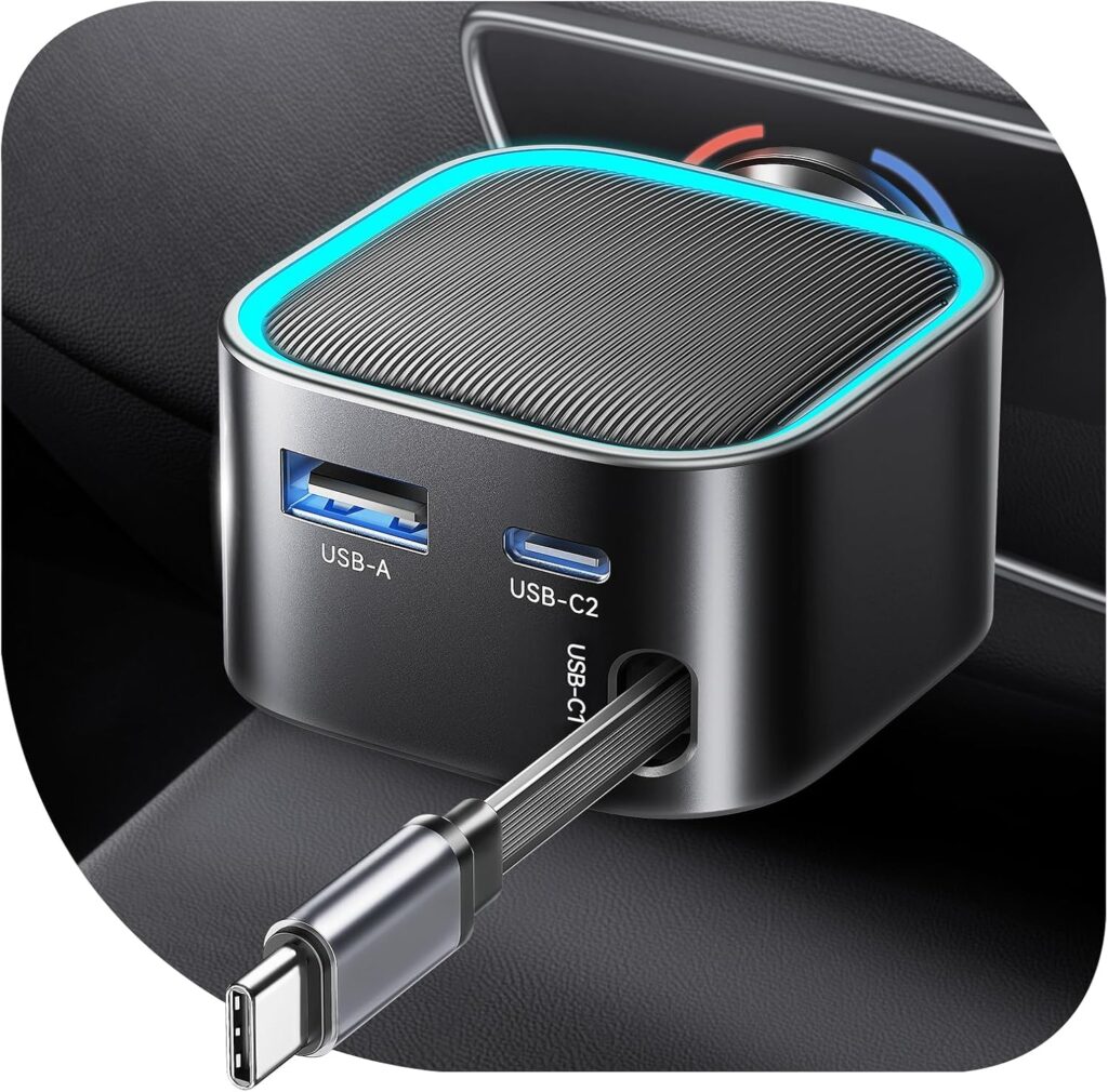 Retractable Car Charger, Fast Charging, USB-A & USB-C ports